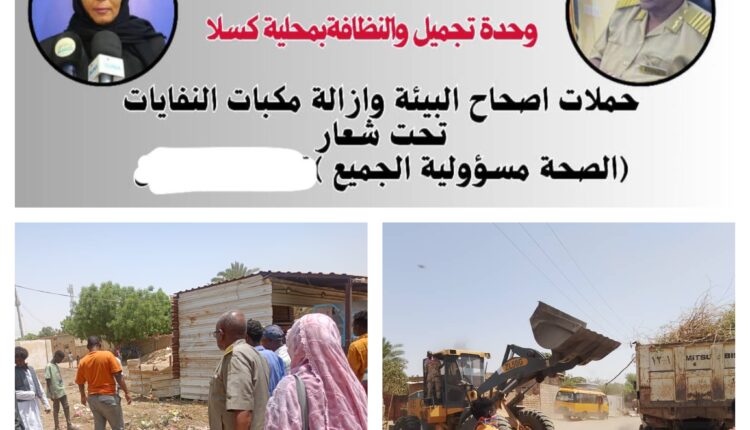 دشن رئيس اتحاد شباب السودان ولاية كسلا الاستاذة انتصار تقلاوي، الحملة الكبرى لإصحاح البيئة وإزالة مكبات الأوساخ بحي الكرمتة تحت شعار (الصحة مسؤولية الجميع معا من أجل محلية خالية من النفايات)، بالتعاون مع الشؤون الصحية وهيئة نظافة وتجميل المدينة وشباب وشابات الحي.