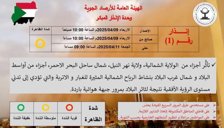 عممت وحدة الإنذار المبكر بالهيئة العامة للأرصاد الجوية نشرة اليوم حذرت فيه من تأثر أجزاء من ولايات الشمالية ونهر النيل واجزاء من أواسط البلاد وساحل البحر الاحمر وشمال غرب البلاد بنشاط الرياح الشمالية المثيرة للغبار والأتربة وتؤدي إلى تدني مستوى الرؤية الأفقية نتيجة لتأثر البلاد بمرور جبهة هوائية باردة .
