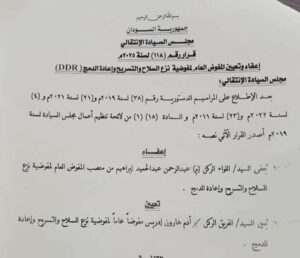 اصدر الفريق أول ركن عبدالفتاح البرهان رئيس مجلس السيادة الانتقالي، قائد الجيش قرار رقم 118 للعام 2025م والذي بموجبه تم اعفاء اللواء ركن م عبدالرحمن عبدالحميد ابراهيم من منصب مفوض عام مفوضية نزع السلاح والتسليح واعادة الدمج