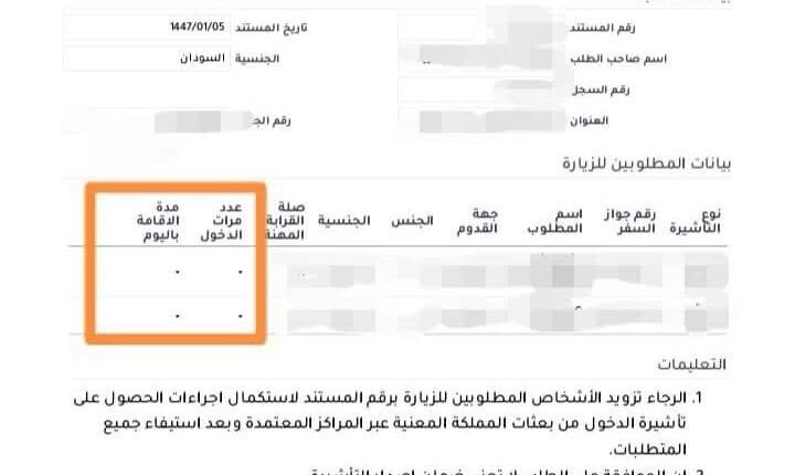 (في مستندات التأشيرة التي صدرت حديثا تجد أن عدد مرات الدخول ومدة الاقامة باليوم تترك فارغة ، ويكتب اسفل المستند كما هو محدد في المستطيل باللون الأزرق ،