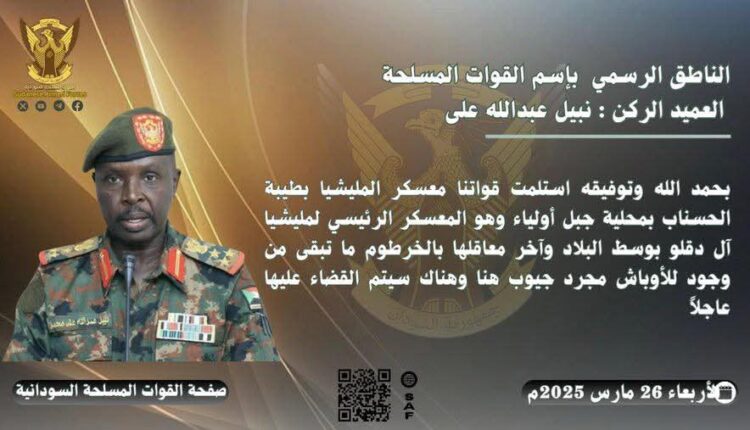 بحمد الله وتوفيقه استلمت قواتنا معسكر المليشيا بطيبة الحسناب بمحلية جبل أولياء وهو المعسكر الرئيسي لمليشيا آل دقلو بوسط البلاد وآخر معاقلها بالخرطوم