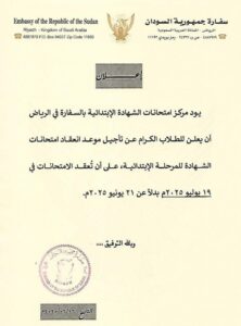 تنوية مهم من سفارة السودان بالرياض بشأن امتحانات الشهادة