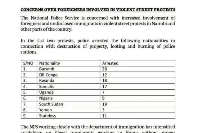 و أعقبت الاعتقالات التي نفذتها السلطات الكينية احتجاجات عنيفة في نيروبي ومدن أخرى، حيث اتهمت السلطات الأجانب بـ “استغلال الفوضى” لزعزعة استقرار الأمن.