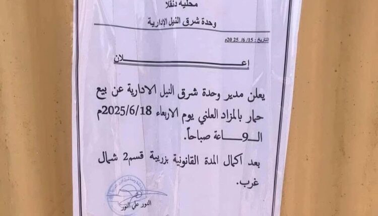 أعلن مدير وحدة شرق النيل الإدارية في محلية دنقلا بالولاية الشمالية عن بيع “حمار” في مزاد علني الأربعاء المقبل، اثار الاعلان جدلا واسعا في وسائل التواصل الاجتماعي بالبلاد، بحسب ما ورد في منشور بصفحة قناة العربية