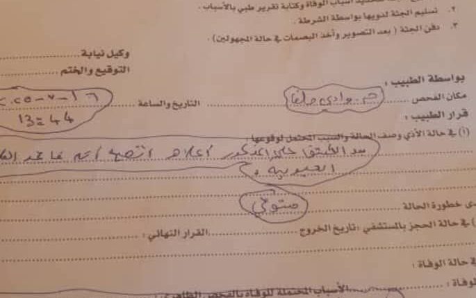 وفور تلقي البلاغ حضرت الشرطة والأدلة الجنائية إلى مكان الوفاة واستكملت كافة الإجراءات القانونية من تصوير ورسم جثمان وعقب الإجراءات تم تحريك الجثمان إلى مستشفى وادي حلفا بموجب الأورنيك الجنائي أرونيك 8 لإجراء الكشف الطبي .