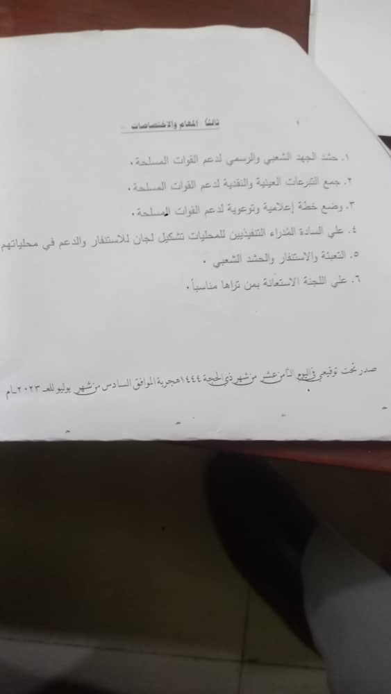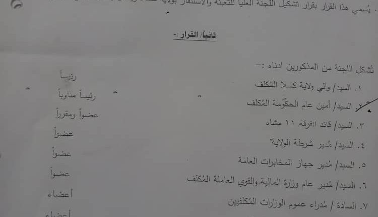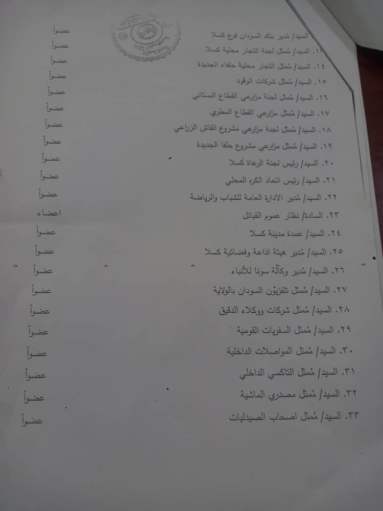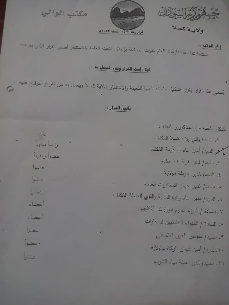 استنادا لنداء القائد ألعام للقوات الشعب المسلحة بإعلان التعبئة العامة والاستنفار اصدر والي ولاية كسلا المكلف الاستاذ محمد موسي عبدالرحمن قرارا بتشكيل اللجنة العليا للاستنفار والتعبئة العامة ذات مهام واختصاصات محددة ابرزها حشد الجهد الشعبي والرسمي لدعم القوات المسلحة وعلي الجهات المعنية وضع القرار محل التنفيذ