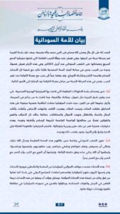 ونذكر بأن كل هذه المحن والتي شهدت بلادنا من بداية الحرب مثيلات عدة لها لا تحجبنا عن الانتصارات والتقدم الملحوظ لقوات بلادنا في جبهات شتى، وفي هذا الصدد تقدم الجماعة كريم التهاني للشعب السوداني والقوات المسلحة والقوات المساندة، ممزوجة بخالص التعازي لأسر الشهداء، داعين لهم بالرحمة ولذويهم وكافة شعبنا بالصبر وحسن العزاء.