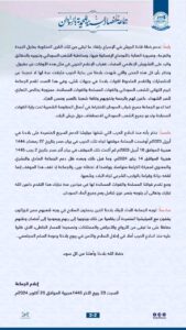 سادساً : توجه الجماعة النداء لأبناء بلادنا الذين يحملون السلاح في وجه شعبهم ممن لايزالون يقفون مع الميليشيا المتمردة أن يقلعوا عن ذلك ويتوبوا إلى ربهم ويعودوا إلى أحضان وطنهم حفاظا على ما تبقى من الأرواح والأعراض والممتلكات وتصحيحا للمسار الخاطىء الذي ظلوا عليه منذ اندلاع الحرب أملا في إحلال السلام والأمن في ربوع بلادنا وعودة السلم المجتمعي.