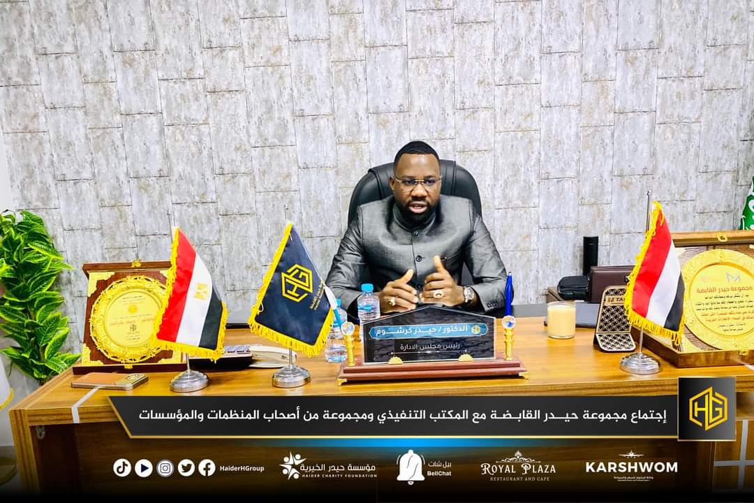 عقدت مجموعة حيدر القابضة إجتماع المكتب التنفيذي برئاسة السيد الدكتور / حيــدر كرشوم، حيث شهد الاجتماع مشاركة مجموعة من أصحاب الاتحادات والمؤسسات التعليمية والمجتمعية، بالإضافة إلى بعض الإعلاميين ورموز المجتمع السوداني والدولي.