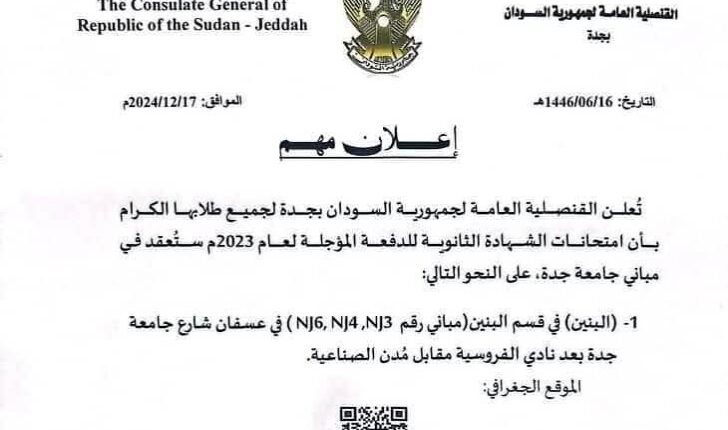 حددت القنصلية السودانية بجدة مباني جامعة جدة لتكون مقرا لإمتحانات الشهادة الثانوية للدفعة المؤجلة لعام 2023م ، والتي تنطلق في يوم 28 ديسمبر 2025م