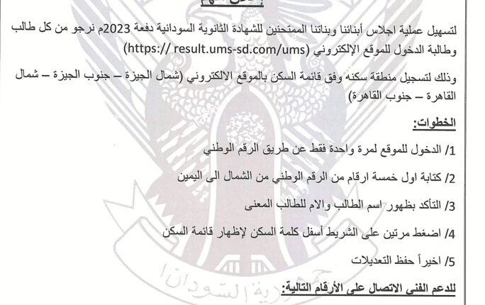 طالبت وزارة التربية والتعليم الطلاب الممتحنين لـ الشهادة السودانية دفعة 2023 بجمهورية مصر العربية الدخول للموقع الإلكتروني إضغط هُنا للتسجيل