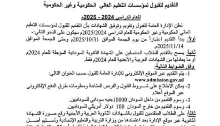ودعت الوزارة الطلاب وأولياء الأمور إلى متابعة الموقع الإلكتروني الرسمي للتقديم [admission.gov.sd](https://admission.gov.sd/admission.html) للاطلاع على دليل القبول، شروط التقديم، ونسب القبول المعتمدة لكل كلية وتخصص.