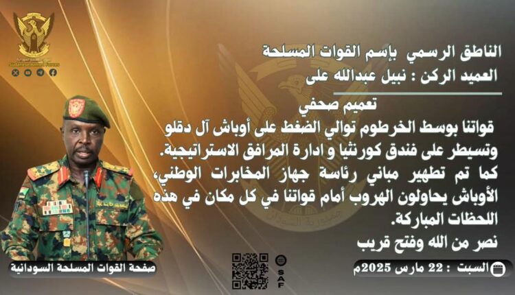 اعلن الناطق الرسمي باسم القوات المسلحة العميد الركن نبيل عبد الله عن انتصارات كبيرة للقوات المسلحة في محيط منطقة المقرن ووسط الخرطوم، مؤكدا بأن عناصر المليشيا المتمردة يحاولون الهروب من أمام الجيش بكل مكان في هذه اللحظات .