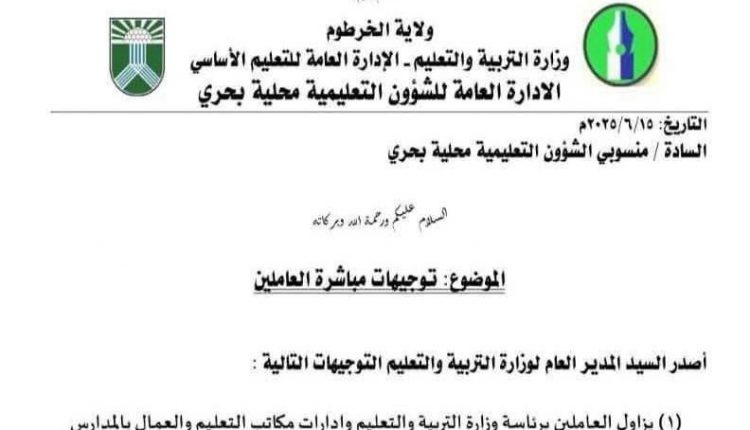أصدر المدير العام لوزارة التربية والتعليم بالخرطوم توجيهات بان يزاول العاملين برئاسة وزارة التربية والتعليم بالخرطوم وإدارات ومكاتب التعليم والعمال والعمال بالمدارس عملهم اعتبارا من اليوم الاحد 2025/6/15