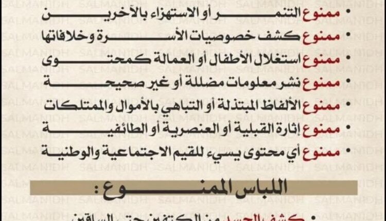 وشملت قائمة المحظورات منع التنمر أو الاستهزاء بالآخرين، كشف خصوصيات الأسرة وخلافاتها، استغلال الأطفال أو العمالة كمحتوى، نشر معلومات مضللة أو غير صحيحة، الألفاظ المبتذلة أو التباهي بالأموال والممتلكات، كون ذلك يسيء للذوق العام ويتعارض مع القيم المجتمعية، إثارة القبلية أو العنصرية أو الطائفية وأي محتوى يسيء للقيم الاجتماعية والوطنية