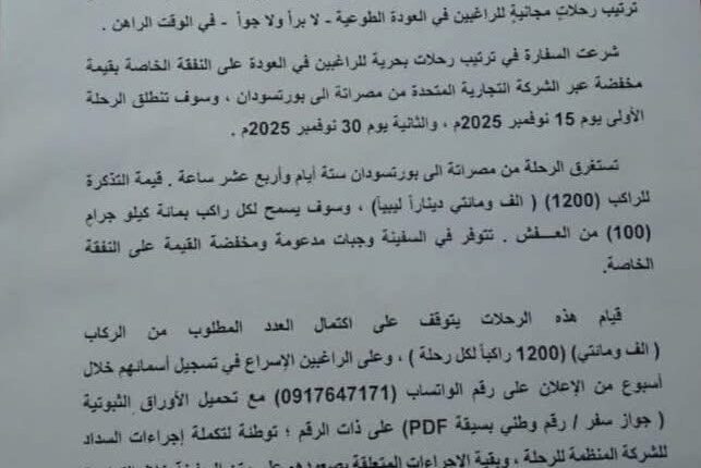 وشددت السفارة السودانية في طرابلس أن قيام الرحلات رهين بإكتمال عدد الركاب داخل الباخرة البالغ 1200 راكباً ودعت السفارة الراغبين في العودة الطوعية للبلاد بتسجيل إسمائهم مع إرسال الأوراق الثبوتية وسداد قيمة تذاكر الباخرة تمهيداً لترحيلهم للبلاد.