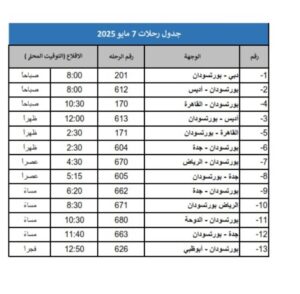 وبحسب ما أوردته مجلة “طيران بلدنا”، فإن الرحلات المدرجة ليوم الأربعاء 7 مايو 2025، أظهرت جدولاً يتضمن رحلتين من مطار بورتسودان إلى كل من أبوظبي ودبي، تشغّلهما شركتا تاركو وبدر للطيران.