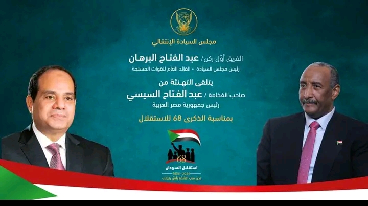 تسلم رئيس مجلس السيادة الإنتقالي الفريق أول ركن #عبدالفتاح_البرهان اليوم برقية تهنئة من الرئيس المصري عبدالفتاح السيسي،بمناسبة الذكرى الثامنة والستين لإستقلال السودان.