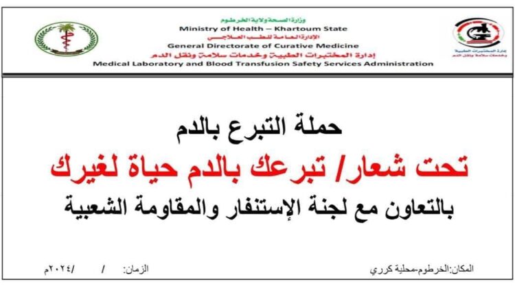 نفذت لجنة الطوارئ الصحية ولاية الخرطوم عبر إدارة المختبرات الطبية وبالتنسيق مع لجنة الاستنفار والمقاومة الشعبية ولاية الخرطوم حملات للتبرع بالدم ضمن سلسلة الحملات الراتبة كل يوم جمعة دعما للجرحى والمصابين ومرضى .غسيل الكلى والعمليات الطارئة والاطفال