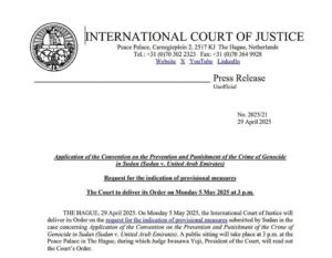 قالت محكمة العدل الدولية، اليوم، إنها ستصدر حكمها في قضية السودان ضد الإمارات يوم الإثنين الموافق 5 مايو المقبل.