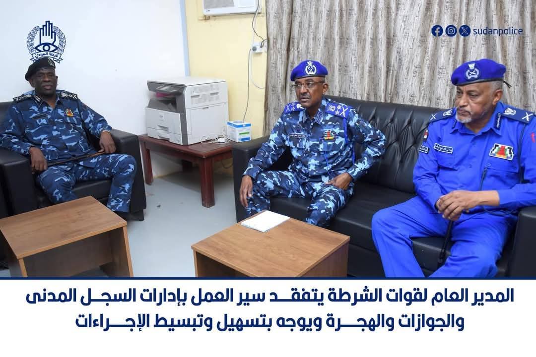 وقف الفريق اول شرطة (حقوقى) خالد حسان محى الدين المدير العام لقوات الشرطة اليوم على جهود إدارات السجل المدنى والجوازات والهجرة فى تقديم الخدمات للجمهور فيما يلى معاملات إستخراج الأوراق الثبوتية من أرقام وطنية والجوازات وذلك بحضور الفريق شرطة عبدالمنعم محمد عبدالقيوم رئيس هيئة الشؤون المالية وكان فى إستقباله اللواء شرطة عثمان محمد الحسن دينكاوى مدير الادارة العامة للجوازات والهجرة واللواء شرطة سامى الصديق دفع الله مدير الادارة العامة للسجل المدنى