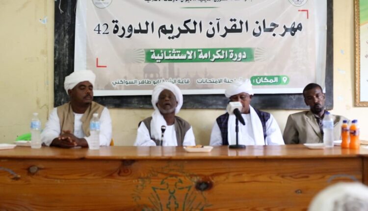 – انطلقت اليوم بقاعة السواكني فعاليات مهرجان القرآن الكريم في دورته(42)دورة الكرامة الاستثنائية التي تنظمها الإدارة العامة للشئون الدينية والاوقاف وقطاع التوجيه برعاية وزير الشئون الدينية عمر بخيت ووالي ولاية البحر الأحمر الفريق ركن مصطفى محمد نور ،ذلك بحضور وزير الشئون الدينية عمر بخيت ومدير عام قطاع التوجيه هاشم الأمين ومدير ادارة الشئون الدينية بالولاية محمد اونور وأمين أمانة الاوقاف محمد علي ادريس وعدد من الشيوخ بالادارات الدينية ولجنة التحكيم والاجهزة الاعلامية والمتسابقين من الطلاب.