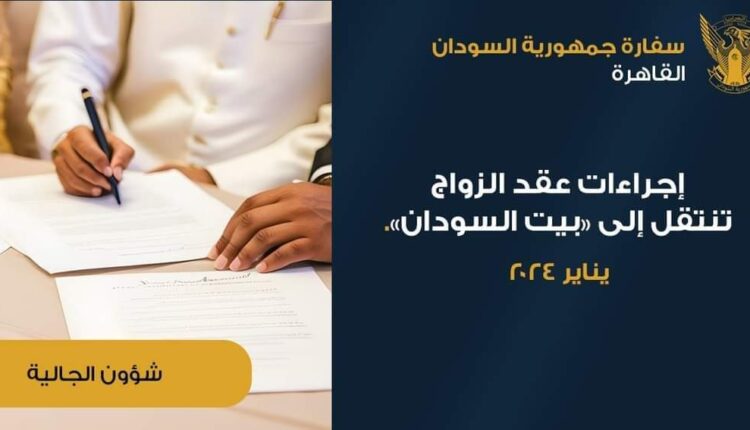قررت سفارة جمهورية السودان بالقاهرة نقل إجراءات عقد الزواج إلى مقر “بيت السودان” بالسيدة زينب، ابتداءً من اليوم الإثنين، الثامن من يناير ٢٠٢٤م. يأتي هذا القرار استجابةً لعدة شكاوى تلقتها السفارة من المواطنين المصريين الذين يعيشون بالقرب من مقر مدرسة الصداقة السودانية، حيث يتم إجراء مراسم عقد القران في هذا المكان منذ فترة.