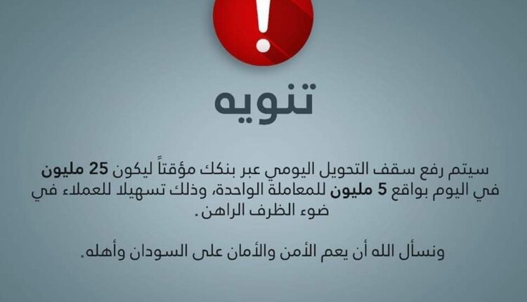 بنك الخرطوم يرفع سقف التحويل اليومي عبر بنكك “مؤقتا”اخبار فنية في أبريل 18, 2023 58 0 بنك الخرطوم يرفع سقف التحويل اليومي عبر بنكك “مؤقتا” ليكون 25 مليون في اليوم، بواقع 5 مليون للمعاملة الواحدة، وذلك تسهيلا للعملاء في ضوء الظرف الراهن. 0 58 شارك FacebookTwitterWhatsAppالبريد الإلكترونيFacebook MessengerTelegram