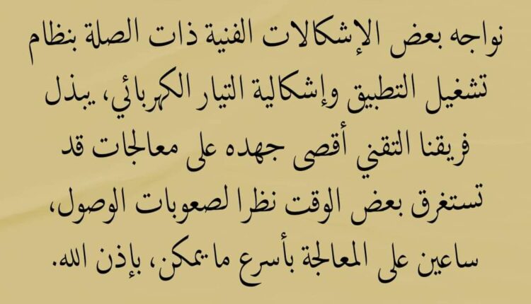 أعزائنا، نواجه بعض الإشكالات الفنية ذات الصلة بنظام تشغيل التطبيق وإشكالية التيار الكهربائي، يبذل فريقنا التقني أقصى جهده على معالجات قد تستغرق بعض الوقت نظرا لصعوبات الوصول، ساعين على المعالجة بأسرع ما يمكن بإذن الله.