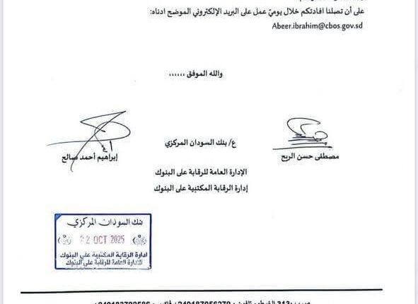 وقال البنك في خطاب معنون إلى المصارف بالإشارة إلى الموضوع أعلاه، وإلى خطاب اللجنة الوطنية للتحقيق في جرائم وانتهاكات القانون الوطني والقانون الدولي الإنساني بتاريخ 2025/10/19، الرجاء حجز وتجميد الحسابات الواردة بالكشف المرفق (39) فردًا، الصالح إجراءات البلاغ بالرقم (2024/1613) و إفادتنا عن الأرصدة إن وجدت طرف مصرفكم على أن تصلنا افادتكم خلال يوم عمل على البريد الإلكتروني.