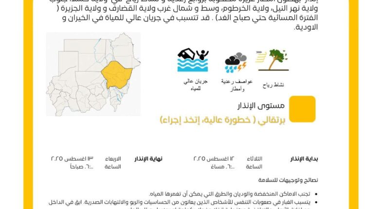 متابعة – الجمهورية نيوز- أصدرت الهيئة العامة للأرصاد الجوية تحذيرًا عالي الخطورة بهطول أمطار غزيرة في عدد من الولايات السودانية. وشمل التحذير ولايات كسلا، جنوب نهر النيل، الخرطوم، وسط وشمال غرب القضارف، والجزيرة.