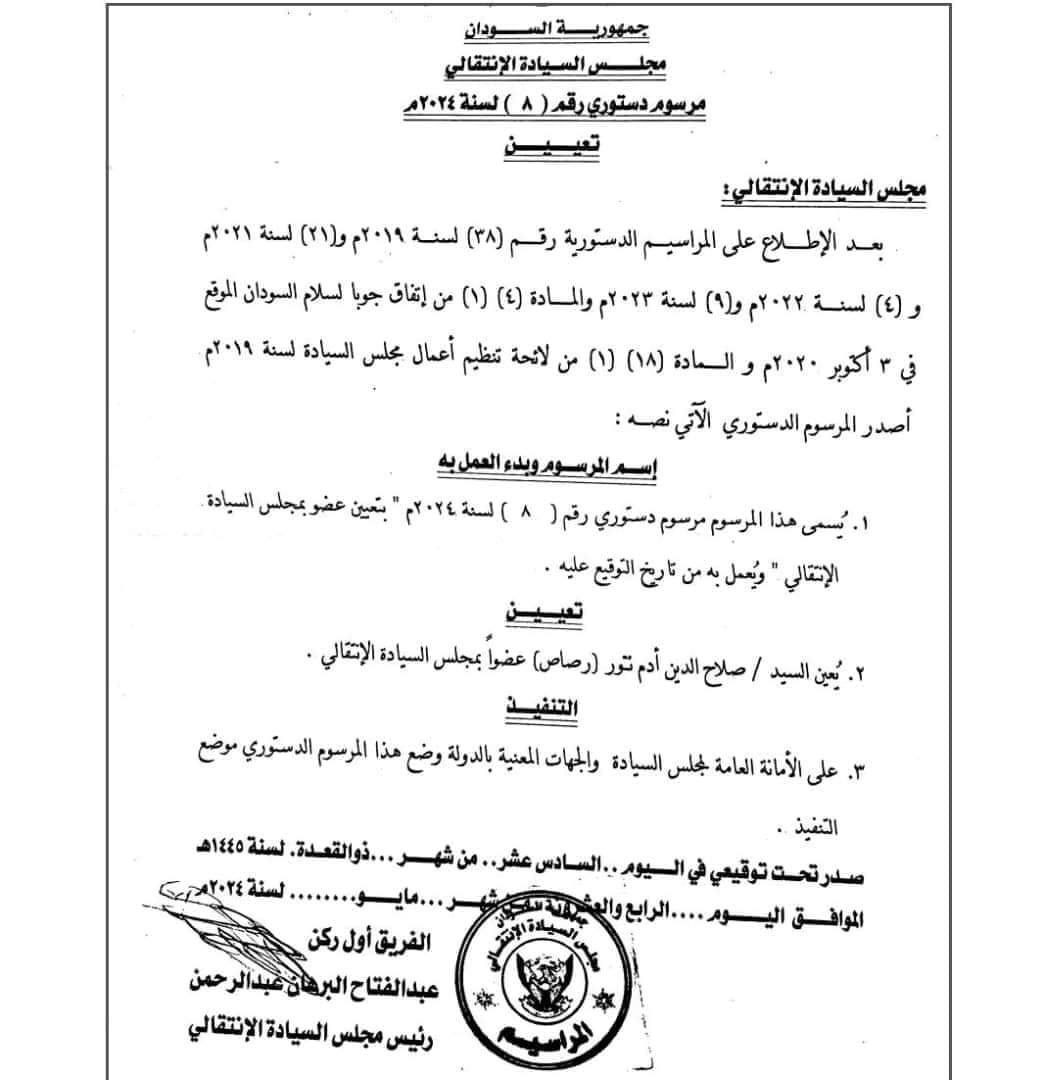 أصدر رئيس مجلس السيادة الإنتقالي الفريق أول ركن/عبدالفتاح البرهان عبدالرحمن مرسوماً دستورياً بالرقم(8)لسنة2024م قضى بتعيين السيد/صلاح الدين آدم تور(رصاص)عضواً بمجلس السيادة الإنتقالي استناداً على المراسيم الدستورية رقم (38)لسنة 2019م و(21)لسنة2021م و(4)لسنة 2022م والمادة (4)(1)من إتفاق جوبا لسلام السودان الموقع في 3اكتوبر2020م والمادة(1)من لائحة تنظيم أعمال مجلس السيادة لسنة 2019م.