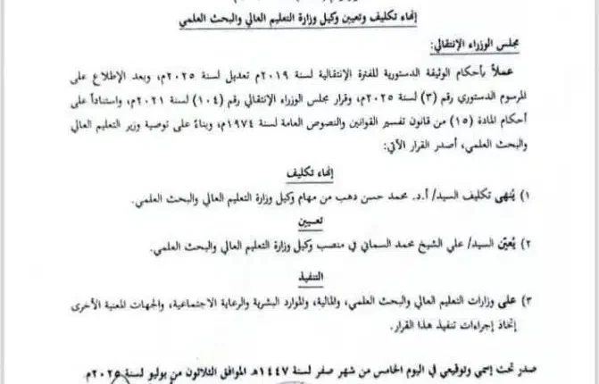 متابعة – الجمهورية نيوز- أصدر رئيس مجلس الوزراء السوداني قرارًا قضى بإعفاء محمد حسن دهب من منصبه كوكيل لوزارة التعليم العالي والبحث العلمي، وتعيين علي الشيخ محمد السماني خلفًا له، في خطوة اعتُبرت ضمن حزمة تغييرات إدارية تهدف إلى إعادة ترتيب مؤسسات الدولة.