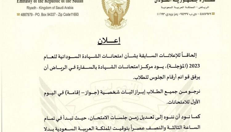 كشفت سفارة السودان بالمملكة العربية السعودية، عن تغيير في مواعيد إمتحانات الشهادة السودانية المؤجلة من العام 2023م ، حيث تبدأ الامتحانات عند الساعة الثالثة و النصف عصرا