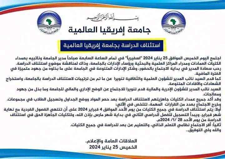 خرج الاجتماع بقرار استئناف الدراسة في كل كليات الجامعة ابتداء من الثامن والعشرين من هذا الشهر يناير 2024 “اونلاين “