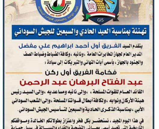 تقدّم الفريق أول أحمد إبراهيم مفضل، المدير العام لجهاز المخابرات العامة، ونائبه، وكافة الضباط وضباط الصف والجنود بالجهاز، بأسمى آيات التهاني والتبريكات إلى الفريق أول ركن عبد الفتاح البرهان، القائد العام للقوات المسلحة، ونائبه، ومساعديه، وإلى رئيس هيئة الأركان ونوابه، ولجميع أبطال القوات المسلحة، وإلى الشعب السوداني الأبي، بمناسبة الذكرى الحادية والسبعين لتأسيس الجيش السوداني.
