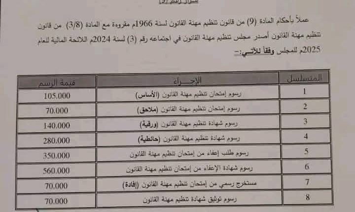 اعلن مجلس تنظيم مهنة القانون في السودان عن زيادات جديدة لعدد من الإجراءات التي يقدمها لمنسوبيه وشملت الزيادات الشهادات الحائطية وطلب الإعفاء من الامتحان بالإضافة لرسوم التوثيق وجاءت اللائحة المالية كالآتي: