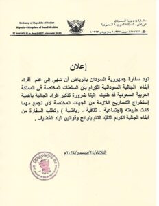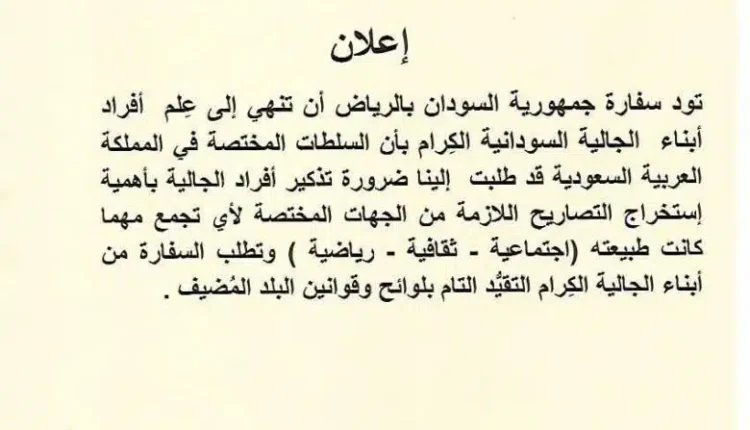 أصدرت سفارة السودان بالرياض، إعلانا نهت فيه إلى علم أفراد أبناء الجالية السودانية الكرام بأن السلطات المختصة في المملكة العربية السعودية قد طلبت، ضرورة تذكير أفراد الجالية بأهمية استخراج التصاريح اللازمة من الجهات المختصة لأي تجمع مهما كانت طبيعته اجتماعية – ثقافية – رياضية.