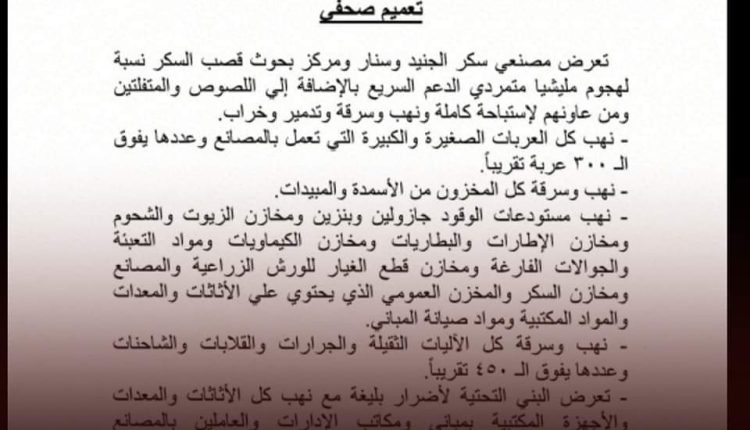 تعرض مصنعي سكر الجنيد وسنار ومركز بحوث قصب السكر نسبة لهجوم مليشيا متمردي الدعم السريع بالإضافة إلي اللصوص والمتفلتين ومن عاونهم لإستباحة كاملة ونهب وسرقة وتدمير وخراب.
