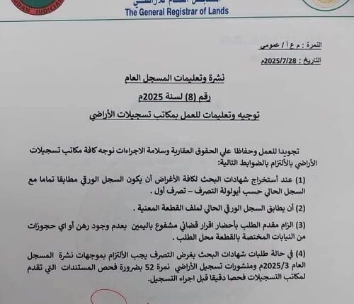 وجه في منشور كافة مكاتب تسجيلات الأراضي إلى الالتزام بجملة من الضوابط، أبرزها عند استخراج شهادات البحث لكافة الأغراض أن يكون السجل الورقي مطابقا تماما مع السجل الحالي حسب أيولولة التصرف – تصرف أول، أن يطابق السجل الورقي الحالي لملف القطعة المعنية.