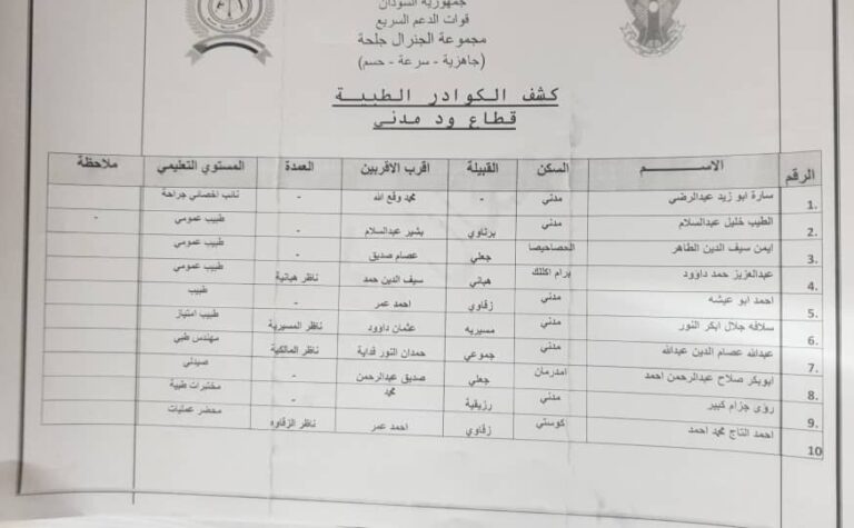 وتتضمن إحدى الوثائق التى تم رفع الستار عنها مجموعة من أسماء أطباء وطبييات نواب اخصائين وعموميين وامتياز يعتقد أن لهم صلة تعاون أو تنسيق بمجوعة الجنرال جلحة وفق معلومات تفصيلية تشمل الاسم ، القبيلة، العمدة.