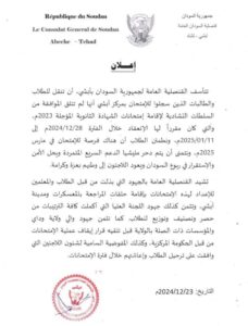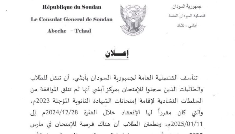 اعلنت القنصلية العامة لجمهورية السودان في ابشي التشادية عدم قيام امتحانات الشهادة السودانية المؤجلة من العام 2023م في دولة تشاد ، بسبب عدم موافقة السلطات التشادية لاقامة الامتحانات رغم تسجيل الطلاب ورفع أسماءهم لوزارة التربية واستخراج ارقام الجلوس، وتأسفت القنصلية لهذا القرار المحزن ، داعية الطلاب الى الاستعداد للامتحانات المعلنة مطلع مارس المقبل