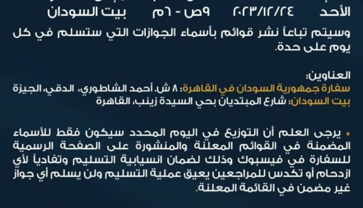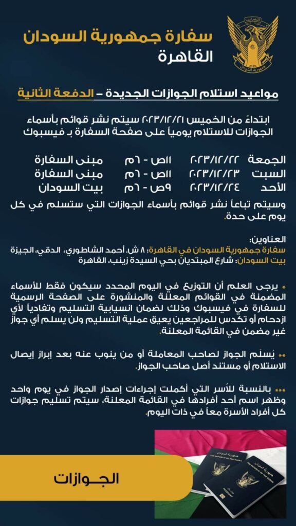 تفأجا عدد من المواطنين والمقيمين السودانيين بجمهورية مصر العربية بقرار مفاجئ من سفارة جمهورية السودان بجمهورية مصر العربية بتأجيل تسليم الجوازات من اليوم ببيت السودان بالسيدة زينب الي يوم غد الجمعة وبعد غد السبت بمقر السفارة بالدقي