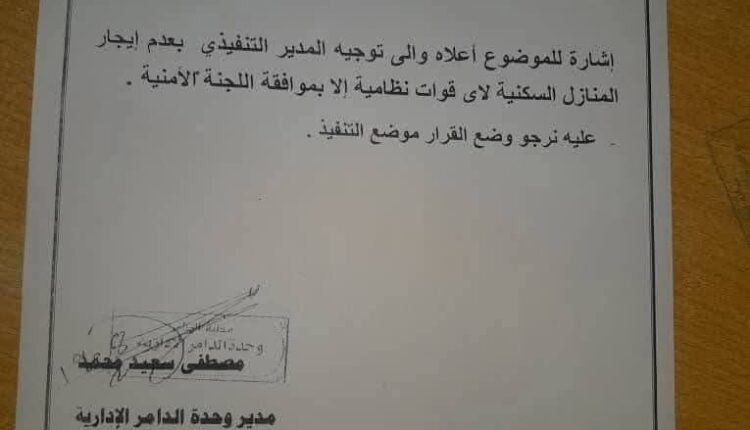 متابعة – الجمهورية نيوز- أصدرت لجنة أمن الدامر بولاية نهر النيل تمنع ايجار المنازل السكنية للقوات النظامية، أصدر مصطفى سعيد مدير وحدة الدامر الإدارية بمحلية الدامر، بولاية نهر النيل شمالي السودان، قراراً قضى بعدم إيجار المنازل السكنية لأي قوات نظامية إلا بعد موافقة اللجنة الأمنية، موجهاً بوضع القرار موضع التنفيذ.