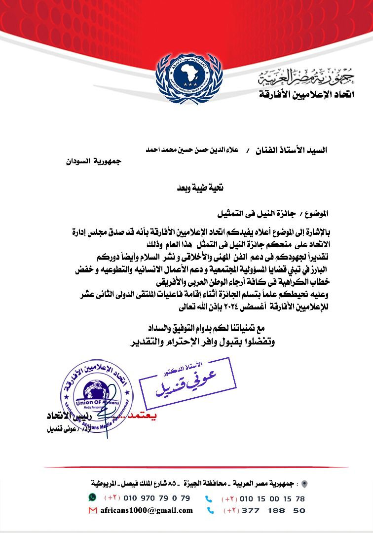 قال رئيس مجلس إدارة إتحاد الإعلاميين الافارقة د.عوني قنديل ان المجلس صادق على منح الاستاذ علاء الدين حسن حسين محمد احمد من السودان جائزة النيل في التمثيل .