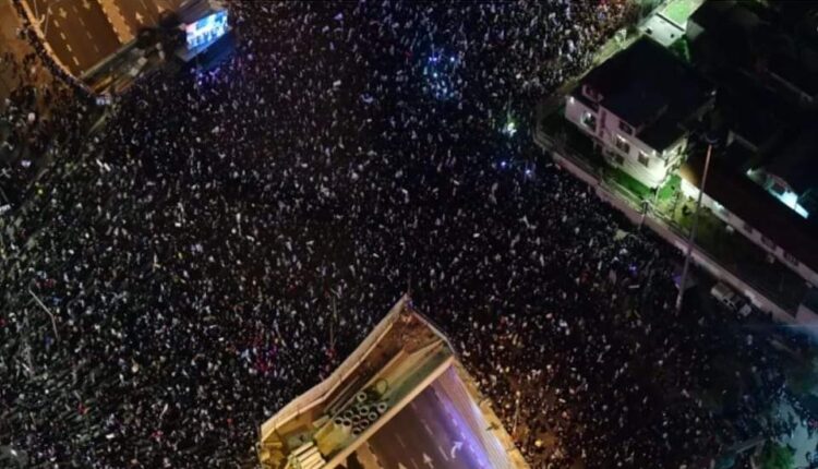 كما لوح الحشود خلال المظاهرات بالأعلام الإسرائيلية وهم يرددون هتافات: “الديمقراطية”، ويغلقون الشوارع والجسور، بما في ذلك طريق أيالون السريع.