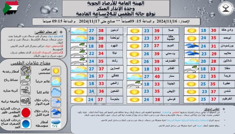 كانت أعلى درجة حرارة سجلت ليوم أمس 39.0 º م في مدينتي كسلا والقضارف وادناها صباح اليوم 18.0º في مدينة النهود.