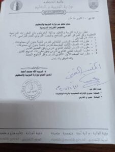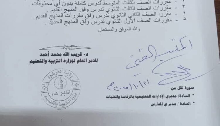 وبحسب البيان إن المقررات هي “مقررات الصف السادس الابتدائي تدرس كاملة بدون أي محذوفات، مقررات الصف الثالث المتوسط تدرس كاملة بدون أي محذوفات، مقررات الصف الثالث الثانوي تدرس وفق المنهج القديم، مقررات الصف الثاني الثانوي تدرس وفق مقررات المنهج القديم ومقررات الصف الأول الثانوي تدرس وفق المنهج الجديد”.