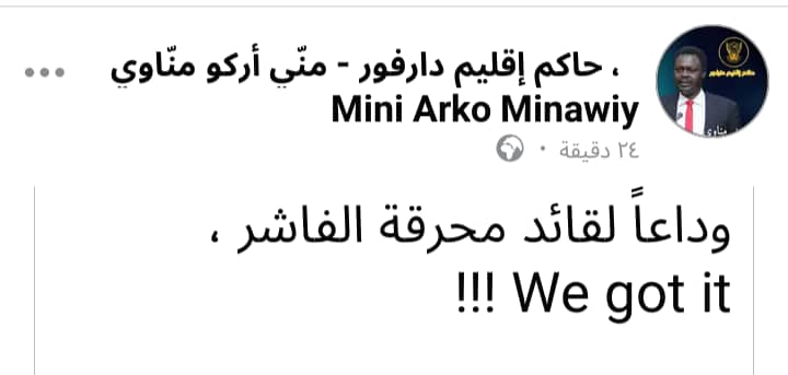 وأعلن حاكم اقليم دارفور مني اركو مناوي رسميا مقتل قائد متحركات الدعم السريع بالفاشر وقال في تدوينة قصيرة (وداعا لقائد محرقة الفاشر).