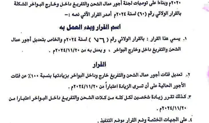 كما نص القرار ايضا على زيادة شخصين بكل (كلة) من “كلات” الشحن والتفريغ داخل البواخر.